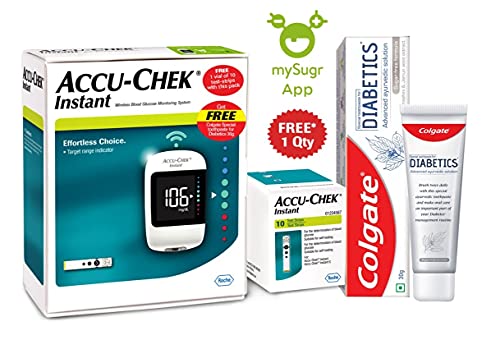 Accu-Chek Instant Glucometer (with Bluetooth) With 10 Strips With Free 30 Gm Pack Of Diabetics Toothpaste