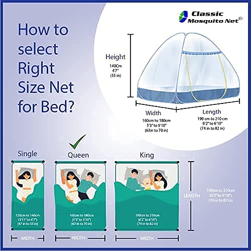 - Size of mosquito net for bed queen size is 200cm X 170cm X 140cm (i.e. 6.5 Ft X 5.5 FtX 4.5 Ft) can Easily accommodate bed for Queen size bed. Suitable for 2 Adults & 1 Child