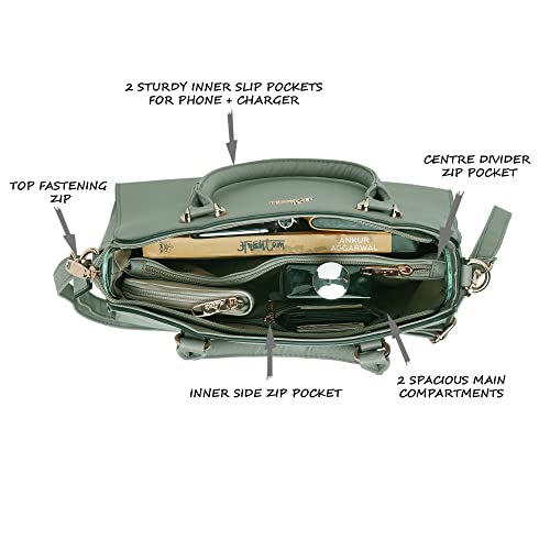 - Ushawu hand bag has a top zip closure for safety and comfort. It is a spacious hand bag, the interior has 2 compartments, divided by an inner zip storage, 2 slip pockets alongside 1 zip pocket, providing plenty of storage space for keeping phone, portable charger, keys, hairbrush, wallet, sunglasses, sanitizer etc. It has dual round cushioned top handles and an adjustable sling belt for multipurpose use.
